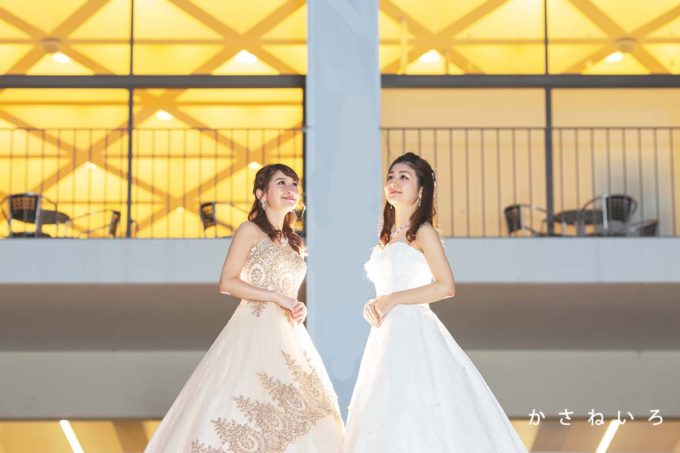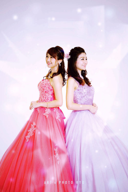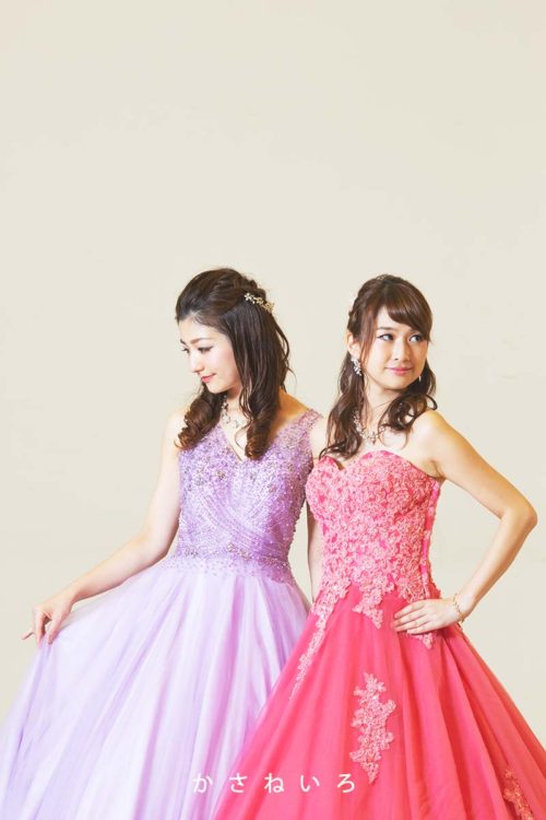 明るい赤系のドレスと薄紫のドレスが重なって、音楽デュオの名前である『かさねいろ』のイメージに合うと感じた。