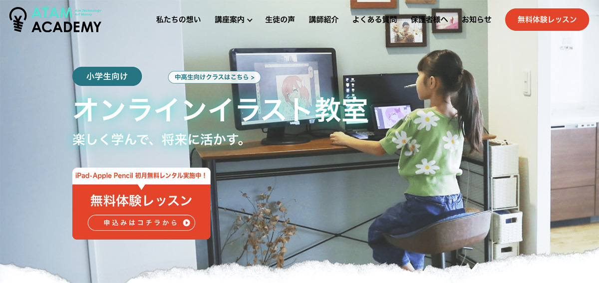 こちらは子供向けになりますが、オンラインでプロのクリエイターからデジタルイラストが学べるオンラインイラスト教室『アタムアカデミー』です。