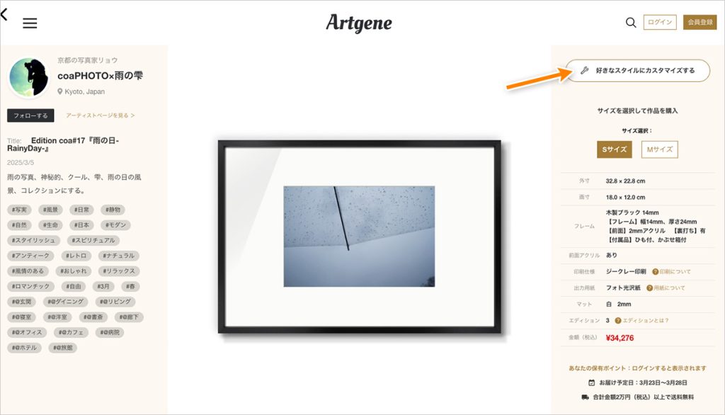 雨の雫が利用している『Artgene 』は、額装とセットで写真作品を購入することができます。