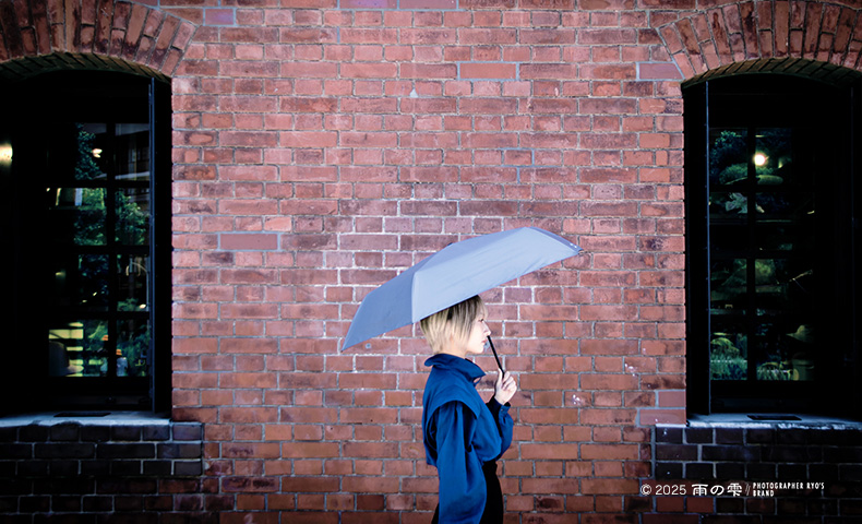 赤レンガの前で雨を待つ女性