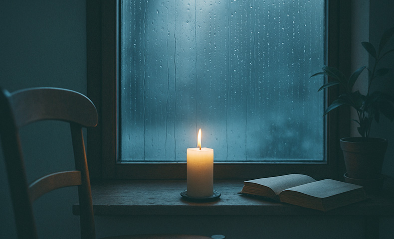 キャンドルに火を灯し、雨の写真に目をとめるひととき。
